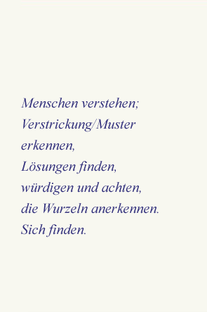 Menschen verstehen; die Verstrickung/Muster erkennen, Lösungen finden, würdigen und achten, die Wurzeln anerkennen. Sich finden.